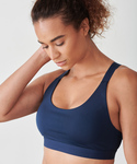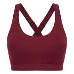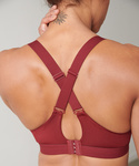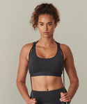 Women's core bra with medium impact. Round neckline with cross over elastic strap back. Bra clasp fastening. Permanent cups, non removeable.