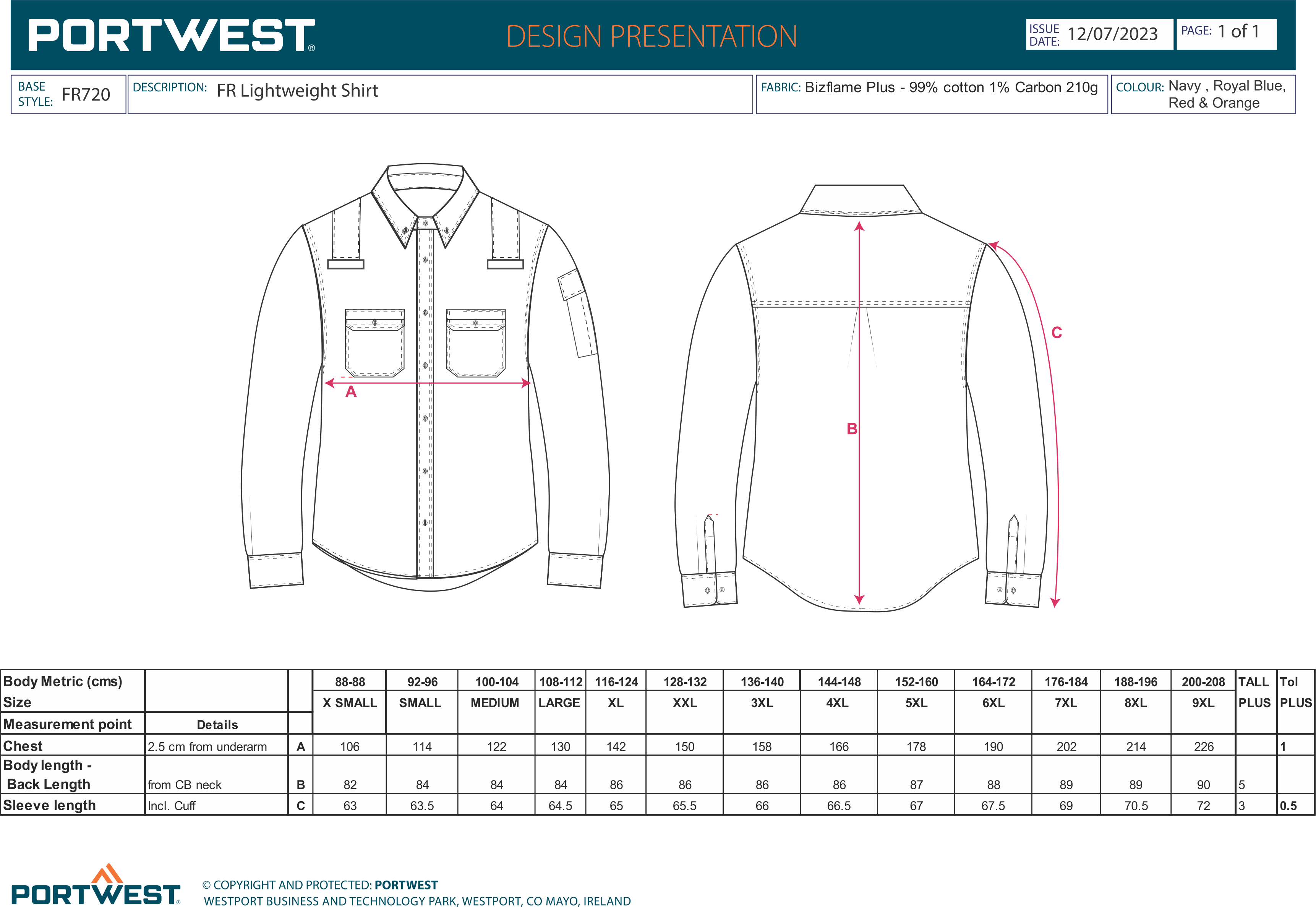 Shell Fabric : Bizflame Work: 99% Cotton, 1% Carbon Fibre 210g